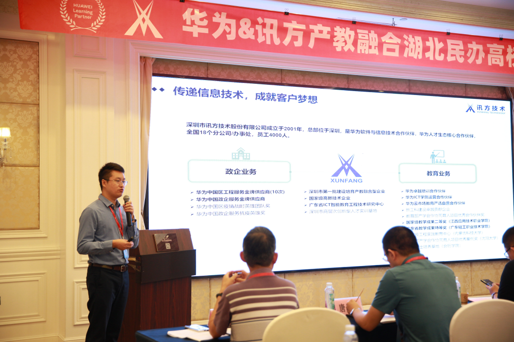 华为湖北省华为云业务总经理-张斌随后致辞。张总代表华为公司向前来参会的各位领导、专家、来宾们表示了热烈欢迎,为能和大家齐聚美丽的温泉之城咸宁,共同探讨“产教融合、协同育人”深化产教融合,促进民办高校教育链、人才链与产业链、创新链有机衔接,开展战略深为期待!张总表示,华为作为全球领先的ICT基础设施和智能终端给予商,致力于把数字世界带入每个人、每个家庭、每个组织,构建万物互联的智能世界,同时华为更是非常重视与高校协同育人,致力于应用型人才的培养。未来我们将结合领先的技术、产品、解决方案及行业数字化转型的案例,联合威九国际这样的优秀伙伴一起,整合上下游产业资源,持续助力人才培养大计。