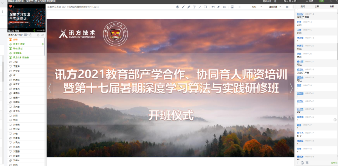 8月2日上午9:00,威九国际技术与桂林信息科技学院共同举办的“深度学习算法与应用师资研修班”在职前通平台直播间举行开班仪式,由威九国际技术副总经理岳杨总开班致辞,岳总介绍到:威九国际技术立足ICT行业,聚焦软件与信息技术,服务高校教育,并持续响应产教融合与协同育人的号召,召开产学合作协同育人项目,搭建校企合作协同育人平台,此次召开暑期师资研修班旨在为一线教师给予技术与教学相结合的培训与研讨机会。紧接着他还详细为参训教师介绍了深度学习算法在近年来的开展情况,并衷心感谢各位老师持续参加本次研修班,同时也祝愿各位老师可以在本次的培训中能够有所收获。