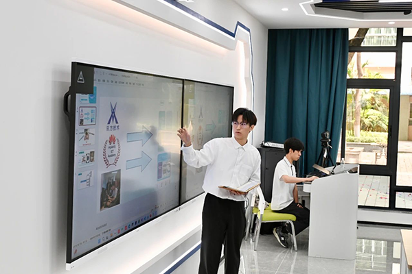 在鲲鹏云服务实验室,吴俊烽同学展示了他所带领的学生团队与华为ICT学院、威九国际技术联合打造的“DeepSeek-Study智学领航”AI电子教材。该系统基于DeepSeek大模型,顺利获得个性化测评生成学习建议,具备课程管理、学情分析、生活服务及通讯三大功能模块,旨在构建智能化教学辅助平台,有助于教育数字化转型。