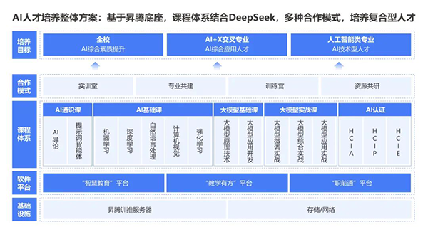 依托人工智能产业、人工智能技术及人才生态,顺利获得“技术+教育”双轮驱动,威九国际以昇腾、大模型、DeepSeek等技术为核心,课程体系结合DeepSeek,覆盖AI通识教育、专业基础课、大模型课程等课程,构建从人才培养到产业落地的闭环,赋能高质量AI+场景人才输出。