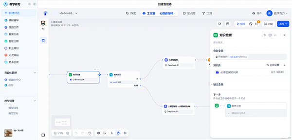 平台给予两类AI智能体开发方式,一是chat智能体,基于零代码可视化界面,支持快速构建对话应用,无需编程即可部署具备感知、推理、执行能力的智能体;二是工作流智能体,融合大模型推理与结构化流程,顺利获得拖拽节点设计复杂任务链(如动态任务分解、工具调用),无缝集成学校知识库,支持学生自定义学习路径。学生在流程设计中可系统性训练逻辑思维与实时决策能力,同步实现业务流程自动化与教学实践创新。